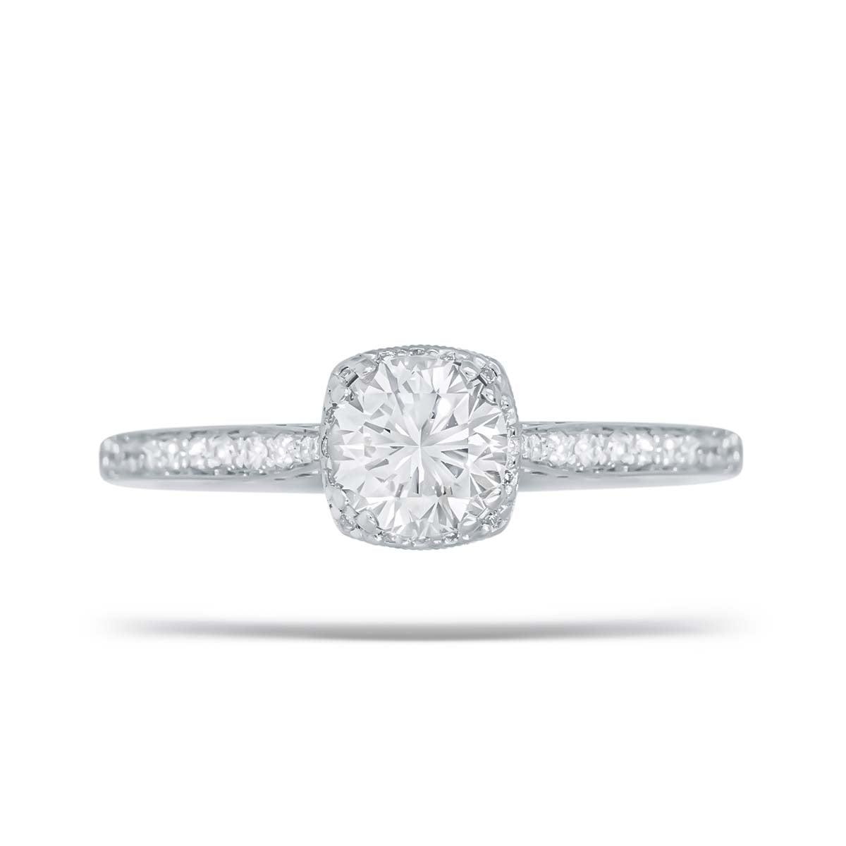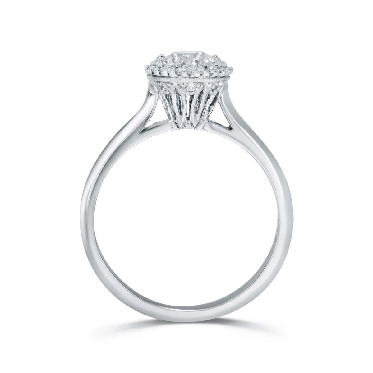 Enhanced by a cushion-shaped halo from the Dantela collection, the 0.84 carat round brilliant cut centre diamond is set to appear as if it is floating within the design. The centre stone is graded VVS-2 clarity, H colour, and good cut, offering exceptional brilliance and refinement.
